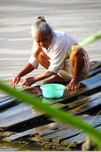 À 4h30, la mosquée entonne un chant tellement suave qu’on lui pardonne. On se retourne dans son lit, songeant que la lune et l’étoile vont accrocher la lumière à son faîte, perlée du ciel de mousson. Le linge sèchera, guirlande aux murs sacrés, d’un bleu définitif. Au matin, les femmes sont en cheveux, voire ceintes d’un sarong sous les bras pour descendre aux pontons : c’est l’heure de la lessive. Les jilbabs viendront plus tard, après la toilette, le rouge à lèvre. Les coquettes en changeront avant midi.