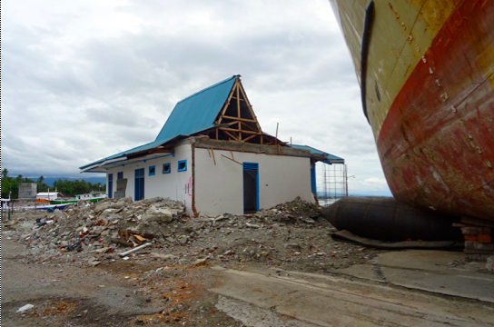 Ucan traverse la route à nouveau, salue le directeur du port. « C’est mon ami », dit-il. Chemise blanche, boucle de ceinture et écussons dorés, visage déserté. Tout deux se tiennent par la main en silence. Leurs regards flottent sur les ruines, sur les maisons temporaires, sur les bateaux inclinés, sur Bakri, Murni et Nasir toujours assis sur le tapis de béton neuf. Ils se taisent, ils se tiennent par la main, l’homme de la sécurité civile et le directeur du port, de ce qui reste du port. Cette amitié-là est plus forte que tout, plus forte que les dix-huit piliers d’alu du nouveau marché. Dans une petite maison blanche qui a perdu son mur de façade, deux hommes jouent aux échecs. Derrière eux, sur le mur blanc, quelqu’un a dessiné une vague, comme surgissant d’une fissure. À côté, on peut lire : « Wani, 28 septembre 2018 ».
