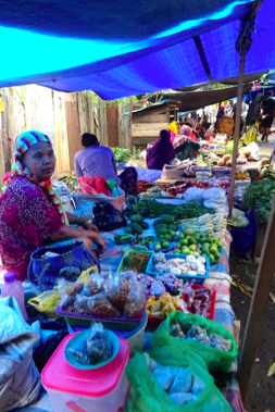Les emplacements du marché provisoire ont été loués jusqu’à la fin du mois, alors, dit-on, on va au bout du bail. Certes, la plupart des vendeuses sont à l’abri de la pluie. Toutes sont assises sur les étals, à la mode asiatique, dans une palette de couleurs filtrée par le bleu des bâches : tomates, choux, haricots, bananes, piments, mangues, bananes. Mais deux ou trois d’entre elles n’ont trouvé place qu’au bord de la route, tenant leurs parapluies, frôlées par les camions et motos. Cette situation préoccupe les autorités locales. « Le gouvernement », comme on dit ici simplement. Il est donc grand temps de rejoindre le nouveau bâti, puisqu’il est prêt.
