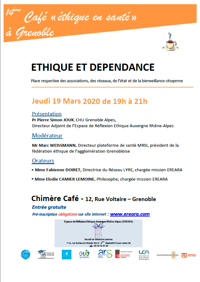 - Jeudi 19 mars à 19h: 14ème Café Éthique-Grenoble Ethique et dépendance pour discuter de la place respective des associations, des réseaux, de l’Etat et de la bienveillance citoyenne. Présentation: Pr. Pierre-Simon Jouk, directeur adjoint de l’Espace de Réflexion Éthique Auvergne Rhône Alpes. Avec la participation de Fabienne Doiret, directrice du réseau Lyre, chargée de mission Ereara et Élodie Carier-Lemoine, philosophe, chargée de mission Ereara. Modérateur: Marc Weissmann, directeur plateforme de santé MRSI, président de la fédération éthique de l’agglomération Grenobloise. Réservation obligatoire sur le site: www.ereara.com