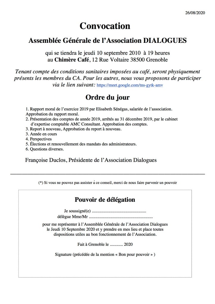 Pour respecter les règles sanitaires, nous ne pourrons accueillir physiquement que les membres du CA. Nous vous proposons de participer en visio en cliquant sur le lien suivant: https://meet.google.com/tns-gytk-amv (c’est automatique sur ordi mais avec un smartphone, il faut télécharger l’application).