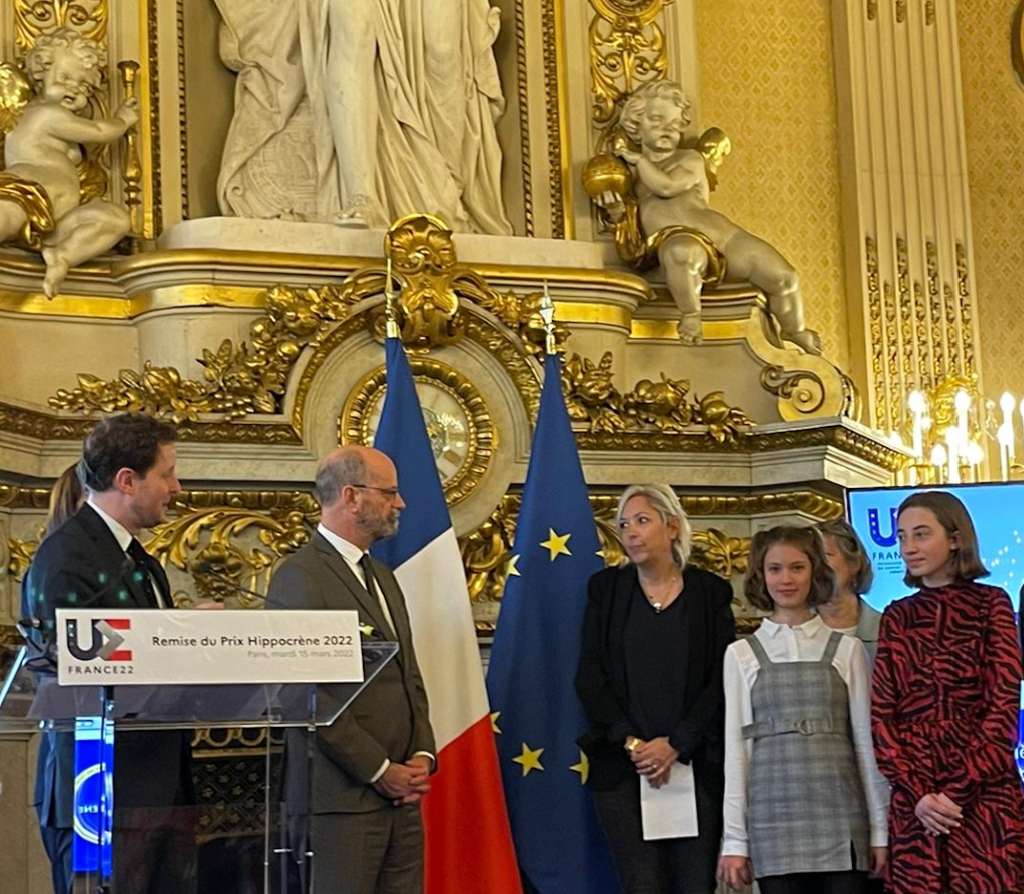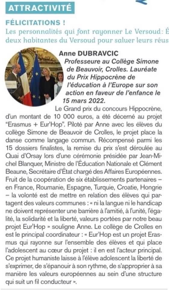 Pour terminer la saison sur une jolie note, nous partageons avec vous l’article concernant Anne Dubravcic, professeure engagée au collège de Crolles (et adhérente de notre association), ainsi que sa classe composée d’élèves de 5e. Le grand prix Hippocrène de l’éducation à l’Europe leur a été décerné (Erasmus) au Quai d’Orsay en mars 2022. Dans le cadre de ce projet, nous avons eu le plaisir d’un partenariat durant la période de confinement en 2021: nous avions organisé une rencontre à distance entre la classe de 5e, la Chimère et l’auteure littérature jeunesse Marie-Aude Murail…