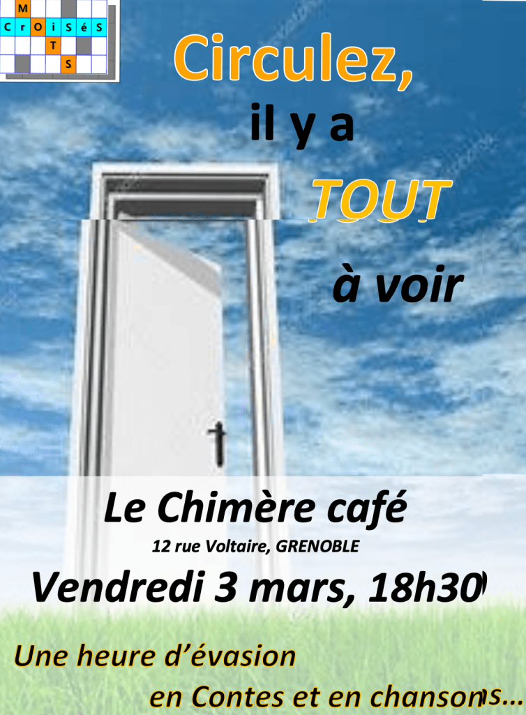 Enfin, pour terminer une info pratique importante : le Chimère café sera fermé du mardi 7 mars au lundi 13 mars inclus.