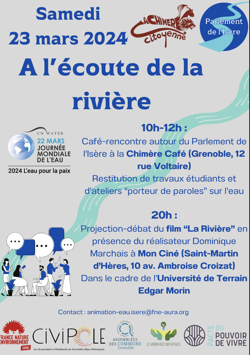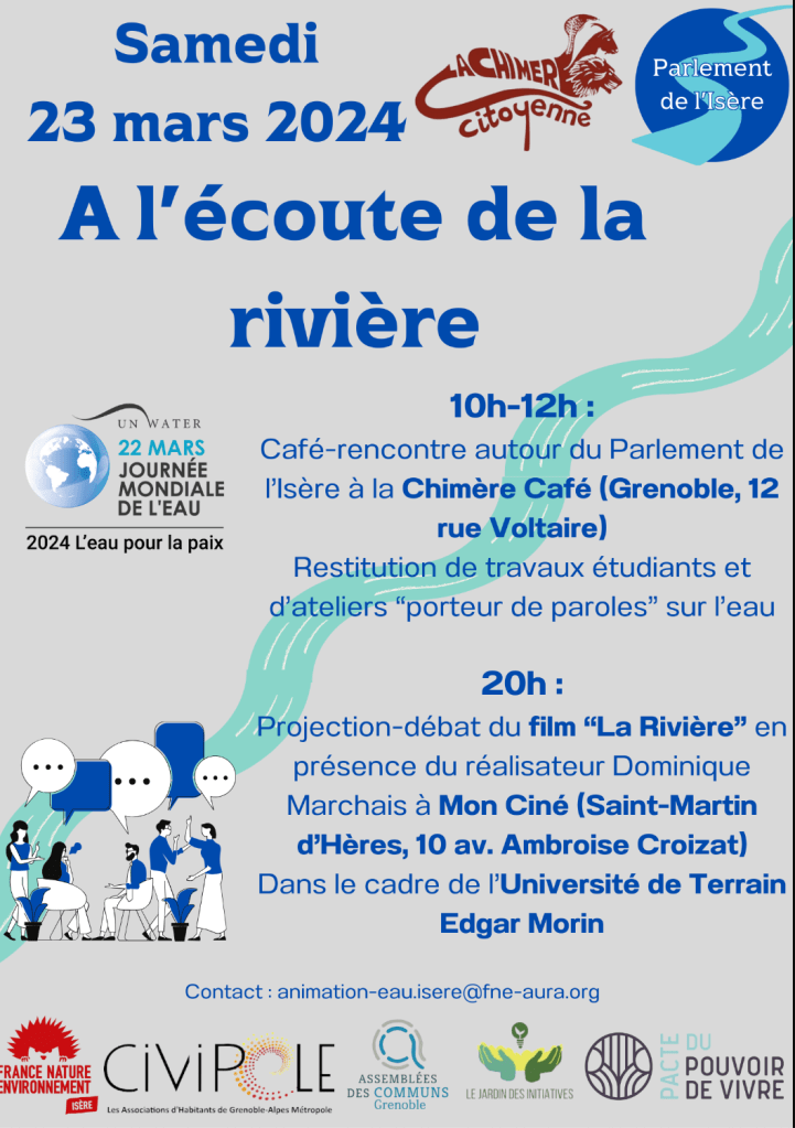 Samedi 23 mars à 20h : Projection du documentaire » La rivière » à MON CINE, Saint-Martin d’Hères, suivie d’un débat en présence du réalisateur Dominique Marchais. Pour répondre aux demandes, l’Université de Terrain Edgar Morin donne ainsi une suite à la rencontre organisée le 25 novembre 23 sur le thème : » Vers un avenir incertain: l’eau, la rareté et nous », en présence de l’hydroclimatologue Florence Habets. Cette projection débat clôt une journée sur le thème de l’eau, (au lendemain de la journée mondiale de l’eau) et se fait en partenariat avec le Parlement de l’Isere, Civipole, France Nature Environnement, l’assemblée des communs, Le Pacte du pouvoir de vivre, le Jardin des initiatives. —>>> L’affiche