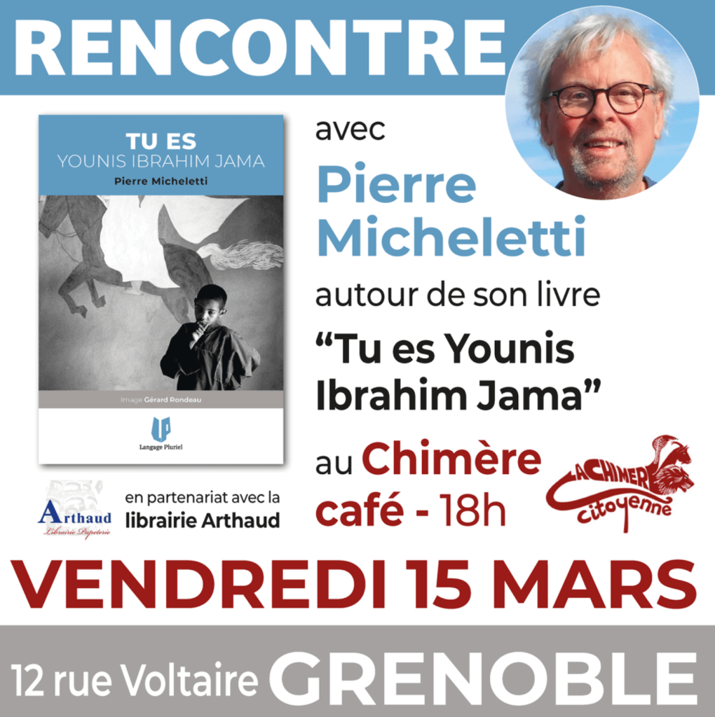 Vendredi 15 mars à 18h : attention temps fort ! Rencontre littéraire avec Pierre Micheletti: « Lectures, débat et coup de projecteur sur le Darfour, au Soudan. » Convergence d’une calamité humanitaire qui s’aggrave et d’une crise catastrophique des droits humains. » (ONU, 15 septembre 2023) – L’affiche