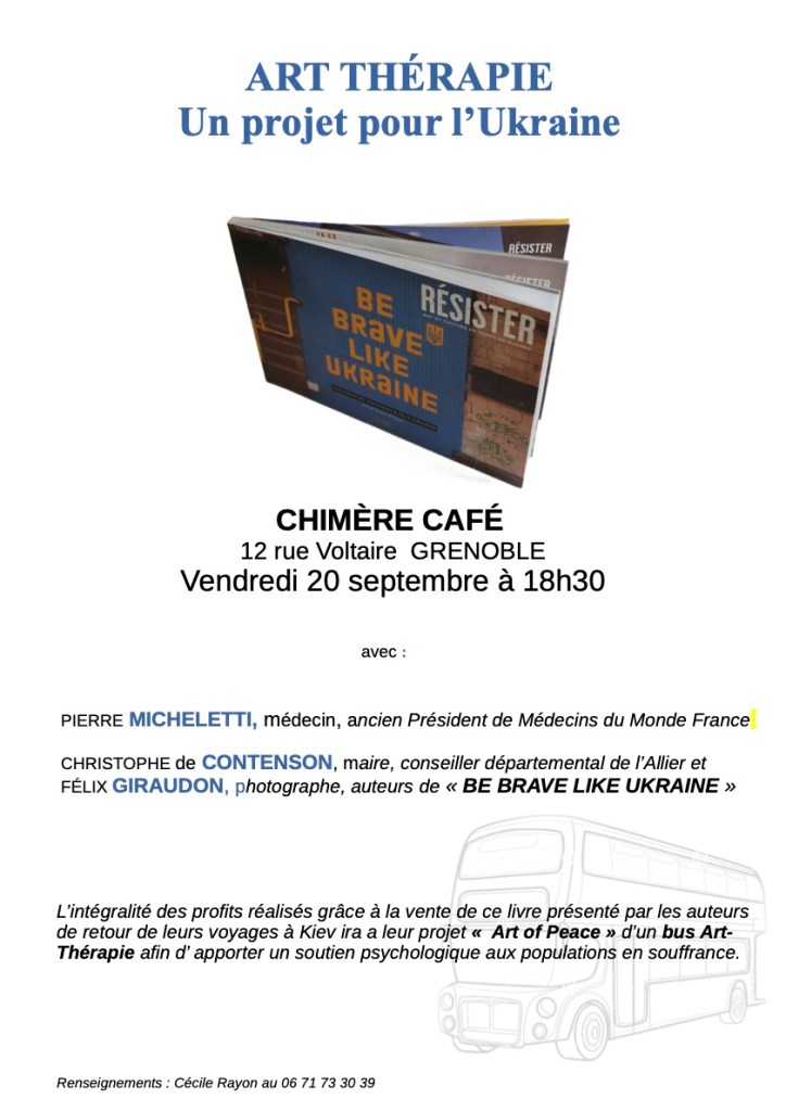 - VENDREDI 20 septembre à 18h30 : avec Art thérapie – Un projet pour l’Ukraine, nous aurons le plaisir d’accueillir Christophe de Contenson, maire et conseiller départemental de l’Allier et Félix Giraudon, photographe, auteurs de BE BRAVE LIKE UKRAINE, ainsi que Pierre Micheletti, médecin, ancien président de Médecins du Monde, spécialiste des questions humanitaires internationales. La rencontre sera ponctuée de la lecture de quelques morceaux choisis par Jean-Luc Moisson, metteur en scène et acteur.